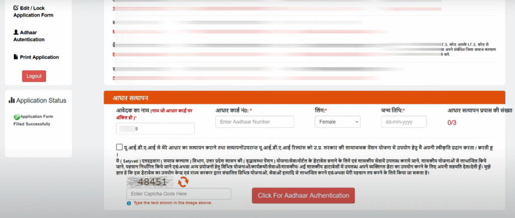 - यहाँ आपको अपना आधार कार्ड नंबर और जन्मतिथि भरने के बाद सहमति बॉक्स (Consent Box) को Tick करने के बाद Captcha को फिल कर देना है I और Click For Aadhaar Authentication बटन पे क्लिक कर देना है I आपका फॉर्म eKyc हो जायेगा I